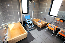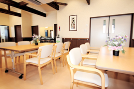 建物正面にはスロープ付きの玄関を備え、清潔感のある外観でお出迎えいたします。内装は全て木に囲まれた、温かみのある作りになっています。その一角にはソファーに腰掛け、テレビを見ながらゆっくりくつろいでいただけるスペースを設けました。